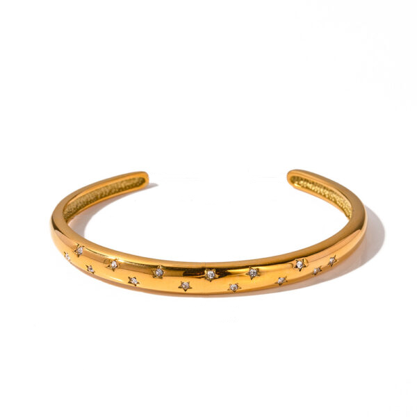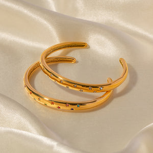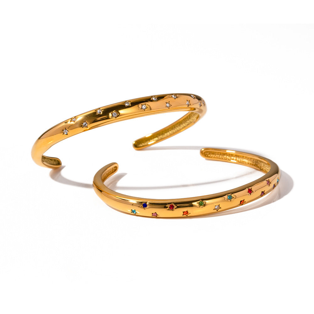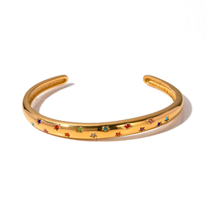 Le Jonc Arc-en-ciel CELESTIA est un bijou à forte personnalité. Il rompt avec la neutralité grâce à ses minuscules cristaux multicolores, tout en conservant une base de jonc épurée et moderne. C'est l'accessoire idéal pour injecter une dose de couleur subtile à une tenue sobre.