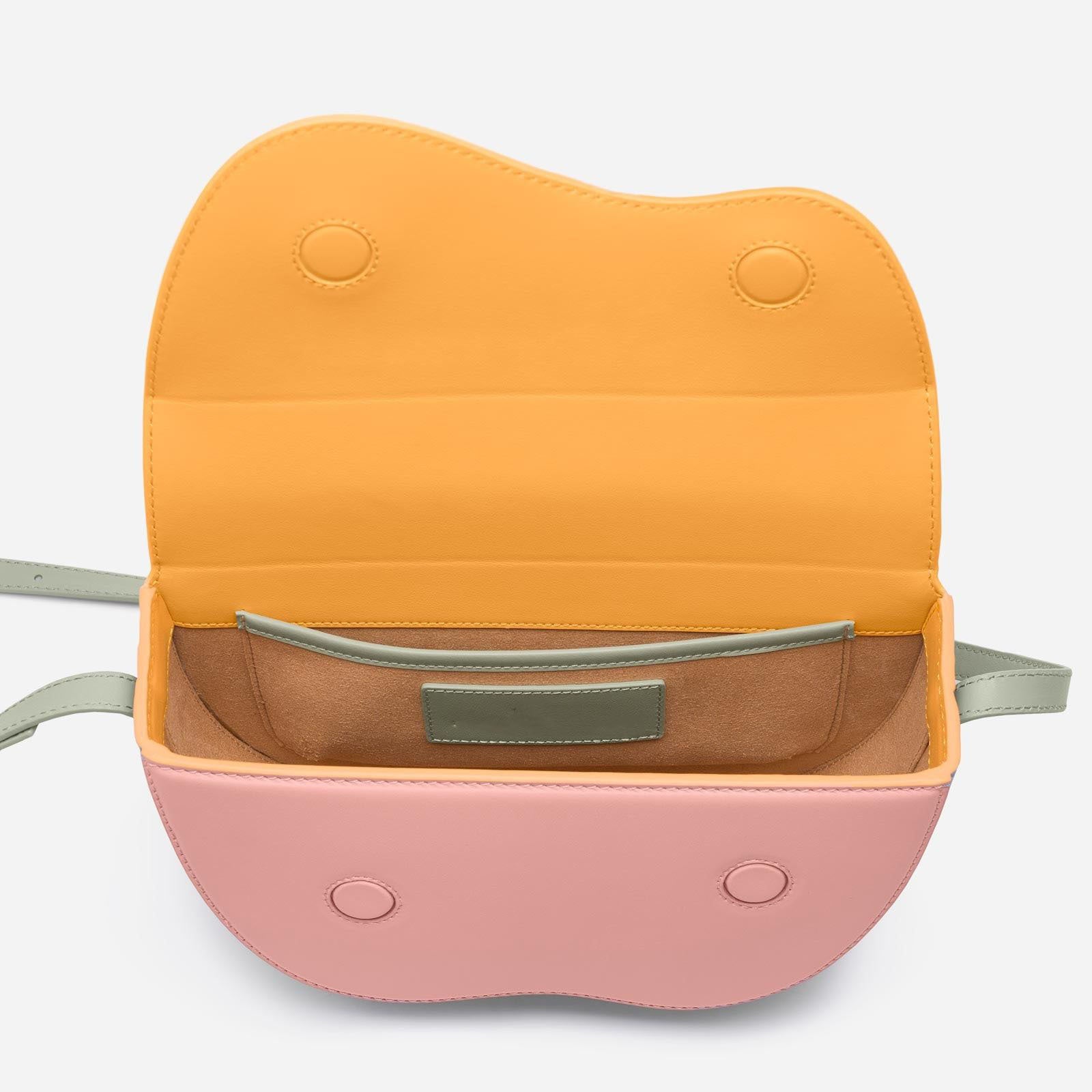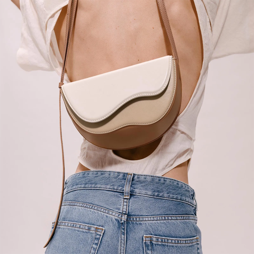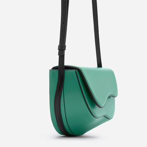 Sa particularité réside dans son rabat asymétrique en forme de vague, qui révèle des strates de couleurs différentes, créant une profondeur visuelle fascinante. Compact et rigide (Shell shape), il protège vos essentiels tout en restant léger à porter grâce à sa fine bandoulière minimaliste. C'est l'accessoire parfait pour un vernissage, un brunch estival ou simplement pour égayer un manteau gris.