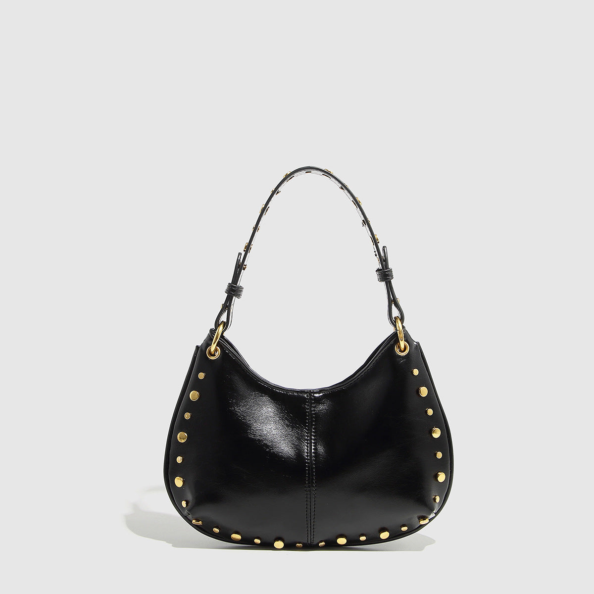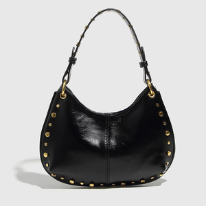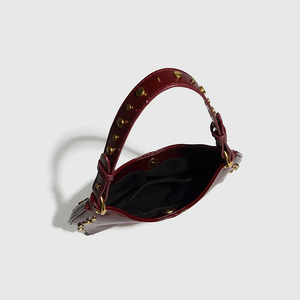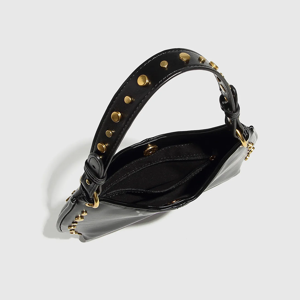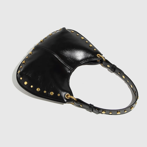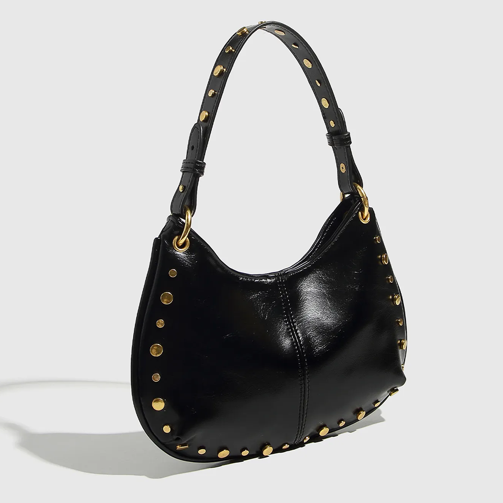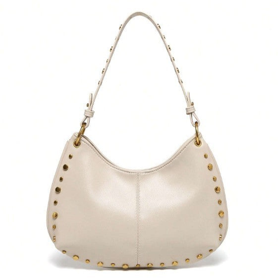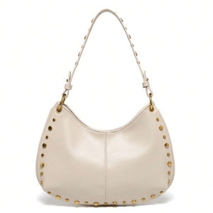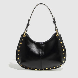 Sa ligne courbe épouse parfaitement la forme du corps sous le bras, tandis que sa finition cloutée (rivets dorés) capte la lumière et attire le regard. C'est le sac idéal pour casser le côté trop sage d'une tenue de bureau ou pour accompagner vos sorties urbaines avec style.